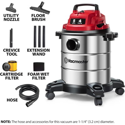 Red Edition Stainless Steel Wet Dry Shop Vacuum 5 Gallon 4 Peak HP 1-1/4 inch Hose Powerful Suction with Blower Function